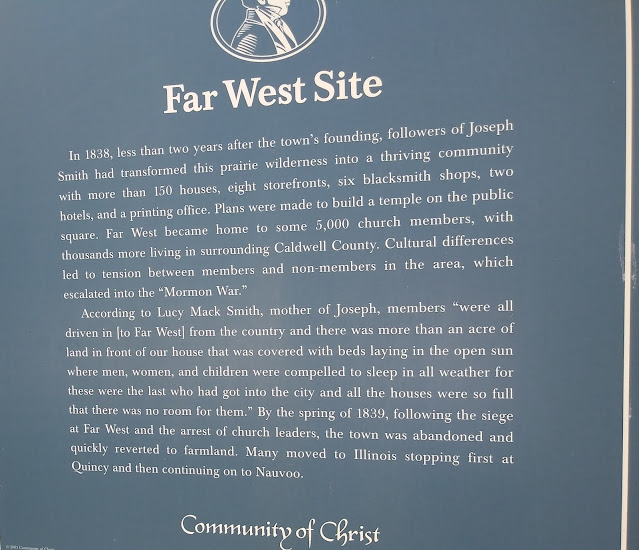 The cornerstones of the Far West Temple were laid before the Saints were driven out, heading temporarily for Quincy, Illinois, before their slightly more permanent settlement in Commerce/Nauvoo, Illinois. Several important revelations were received here. The property now belongs to the Church of Christ, which split off later.